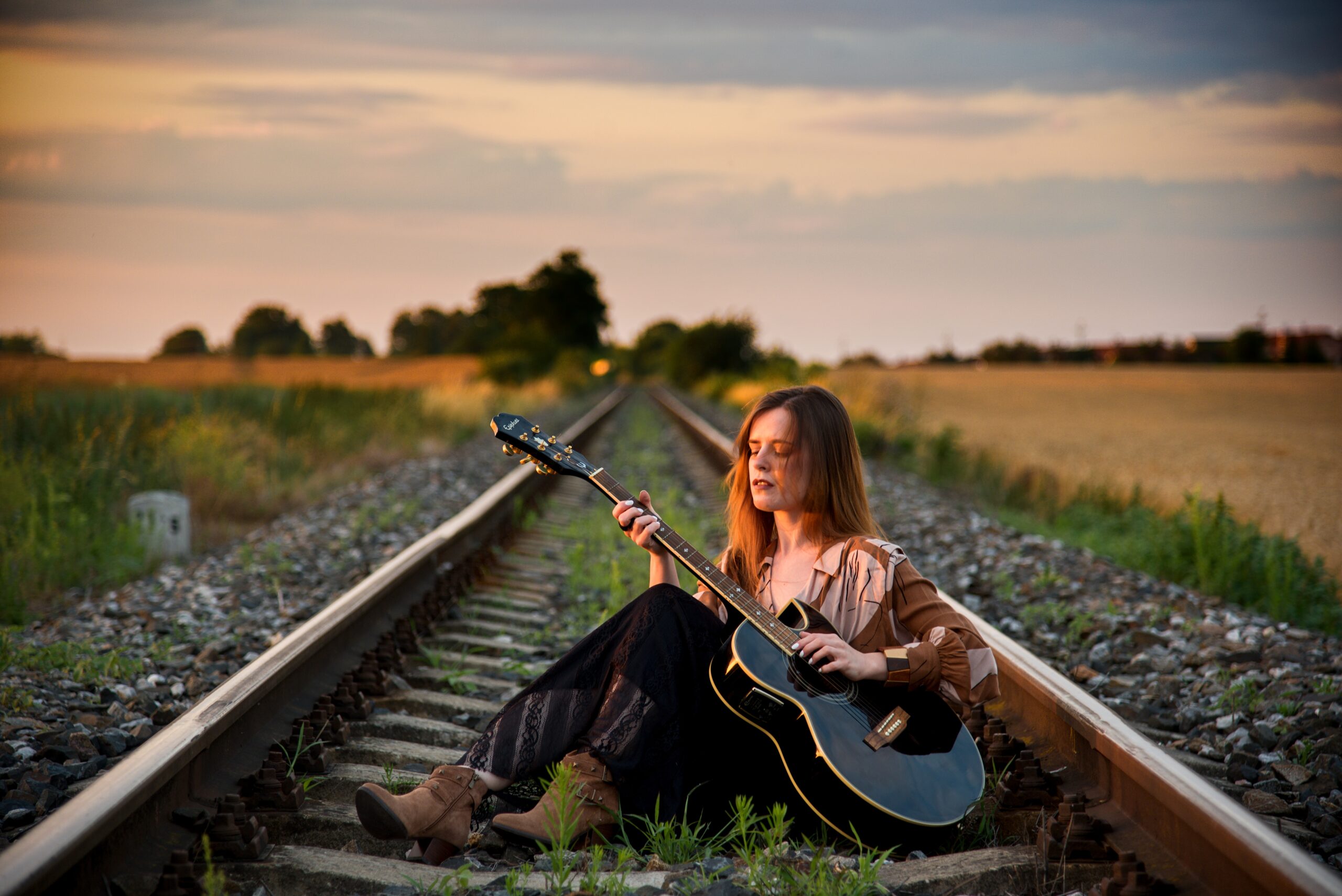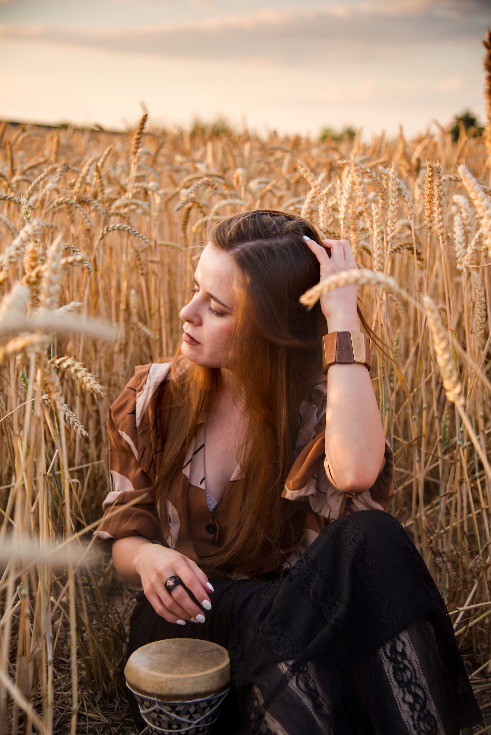 Vybrala jsem outfit v boho stylu, který se dokonale hodí k pšeničnému poli. Volná košile s uzlem, ažurová sukně a kožené kovbojky trochu evokují vzhled hippie-vagabunda, kterému k dokonalosti chybí už jenom kytara.